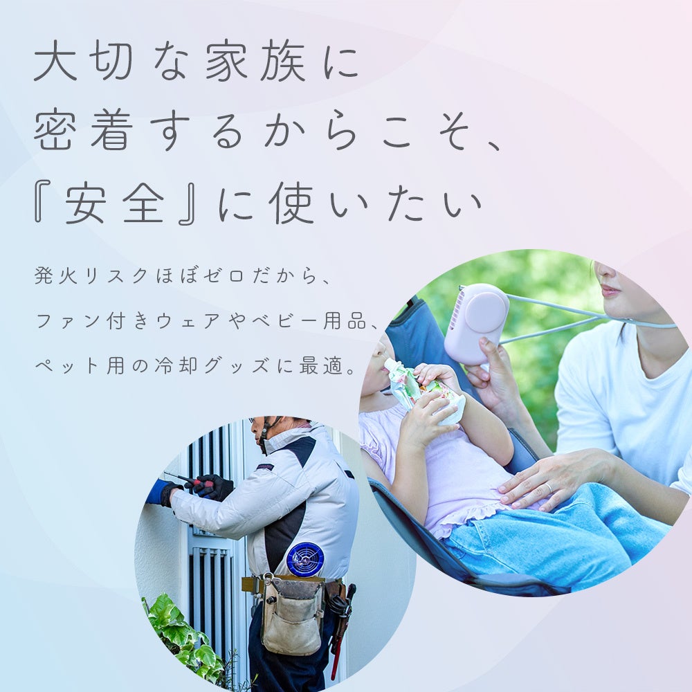 発火リスクがほぼゼロなので、ファン付きウェアやベビー用品、ペット用の冷却グッズにも最適。