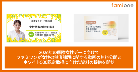 「子どもを願うすべての人によりそい 幸せな人生を歩める社会をつくる」をビジョンに掲げ、法人の従業員向け福利厚生や自治体の住民向け支援を行うヘルスケアサポートサービス「ファミワン」 https://famione.com/benefit/ などを展開する株式会社ファミワン(本社:東京都渋谷区、代表取締役:石川勇介)は、国際女性デーに向け、女性の健康課題に関する動画の公開とホワイト500認定取得に向けた資料の提供を開始をいたします。