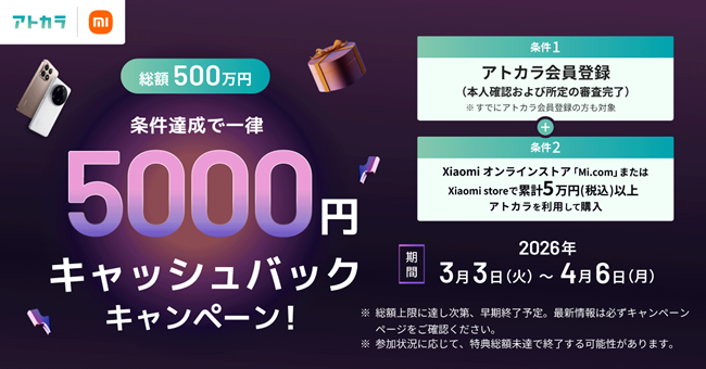 キャンペーン特設サイト:https://www.atokara.jp/campaign/xiaomi/20260303_cp/?utm_source=web&utm_medium=organic&utm_campaign=cashback_cp_202603_xiaomi&utm_content=smcc_prtimes