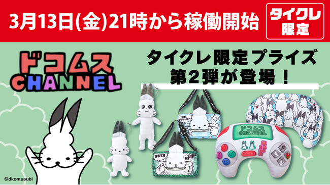 24時間おうちでクレーンゲームを楽しめるオンラインクレーン「タイクレ」が再び「ドコムスチャンネル」とコラボレーション決定!3月13日(金)21時よりタイクレ限定プライズ第2弾が登場!