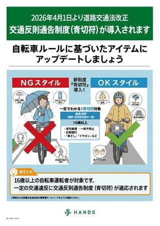 株式会社ハンズ(本社:東京都新宿区)は、2026年4月1日より施行される改正道路交通法「青切符(交通反則通告制度)」への対応を支援する自転車アイテムの特設コーナーをよりハンズ各店にて展開しております。