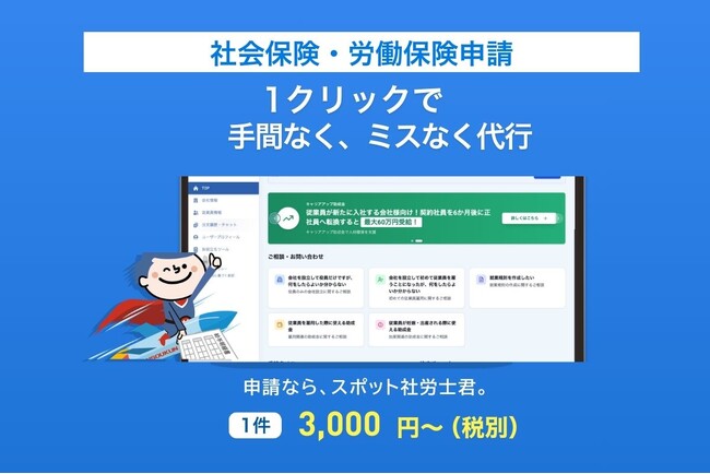 スポット社労士くん社会保険労務士法人(本社:東京都千代田区、以下「スポット社労士くん」)は、企業の社会保険・労働保険に関する申請をクラウド上で社労士事務所に1件単位で依頼できる社会保険・労働保険申請代行クラウドシステム、「スポットポータル」の本格提供を開始したことをお知らせいたします。
