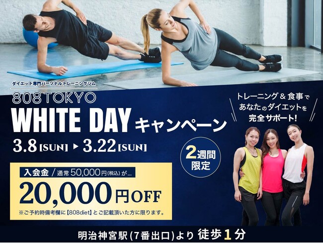 【2週間限定】入会金20,000円OFF|表参道ダイエット専門パーソナルトレーニングジム「808TOKYO」ホワイトデーキャンペーン開始!!