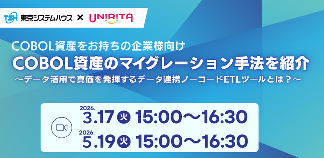 ITサービスの提供を行う東京システムハウス株式会社(本社:東京都品川区、代表取締役:林 知之、以下「東京システムハウス」)は、株式会社ユニリタ(本社:東京都港区、代表取締役 社長執行役員:北野 裕行、東証スタンダード市場:3800、以下「ユニリタ」) と共同で、オンラインセミナー「COBOL資産のマイグレーション手法を紹介~データ活用で真価を発揮するデータ連携ノーコードETLツールとは?~」を2026 年 3月17日(火)および5月19日(火)に開催いたします。