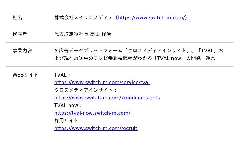 スイッチメディアについて株式会社スイッチメディアは、テレビCM+デジタル広告の出稿データを統一指標で一元管理し、過去比較やブランド横断分析を通じてメディア予算アロケーションを支援するAI広告データプラットフォーム「クロスメディアインサイト」、また国内最大規模のテレビ視聴パネルから取得したテレビCM接触データとインテージ社の購買データ(SCI(R))をシングルソースで連携させ、テレビCMの売上効果の分析を実現する「TVAL」の開発・運営を行っています。