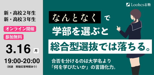総合型選抜(旧AO入試)専門塾「Loohcs志塾」(運営:Loohcs株式会社、東京都渋谷区)は、2026年3月16日(月)に、新高校2年生・新高校3年生を対象としたオンラインイベント「総合型選抜のための『学部選び』ガイダンス」を開催いたします。