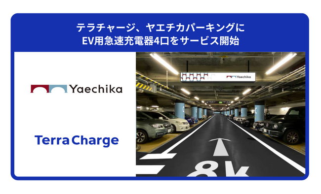 EV(電気自動車)向け充電サービス「Terra Charge(テラチャージ)」を展開するTerra Charge 株式会社(本社:東京都港区、代表取締役社長:徳重徹、以下「当社」)は、八重洲地下街株式会社(本社:中央区、代表取締役社長:窪田弘美、以下「八重洲地下街」)のヤエチカパーキングへ120kW出力のEV用急速充電器4口を設置し、サービス開始いたしました。