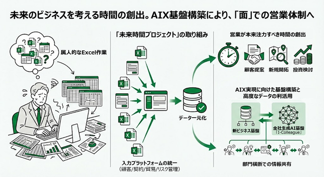 「未来時間プロジェクト」では、システム化されていなかった業務領域をシステム化することで入力プラットフォームを統一し、属人的なExcel作業の削減とデータの一元化を実現。これら業務の省力化により、営業が本来注力すべき「顧客提案・新規開拓・投資検討」のための時間を創出します。 本システムは、2025年7月より本格稼働を開始しました。今後は単なるシステム刷新にとどまらず、伊藤忠商事様の全社生成AI基盤「I-Colleague」との連携によって高度なデータ利活用を推進し、AIトランスフォーメーション(AIX)を加速させます。結果としてさらなる効率化の促進および、部門横断での情報共有を円滑化し、「面」での営業体制を構築します。