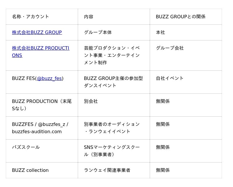 当社が主催する参加型ダンスイベント 「BUZZ FES」(Instagram公式アカウント: @buzz_fes) は、株式会社BUZZ GROUPが企画・運営する正式な自社イベントです。 BUZZ FESに関する公式情報は、Instagram @buzz_fes および当社公式サイト(group-buzz.com)よりご確認ください。