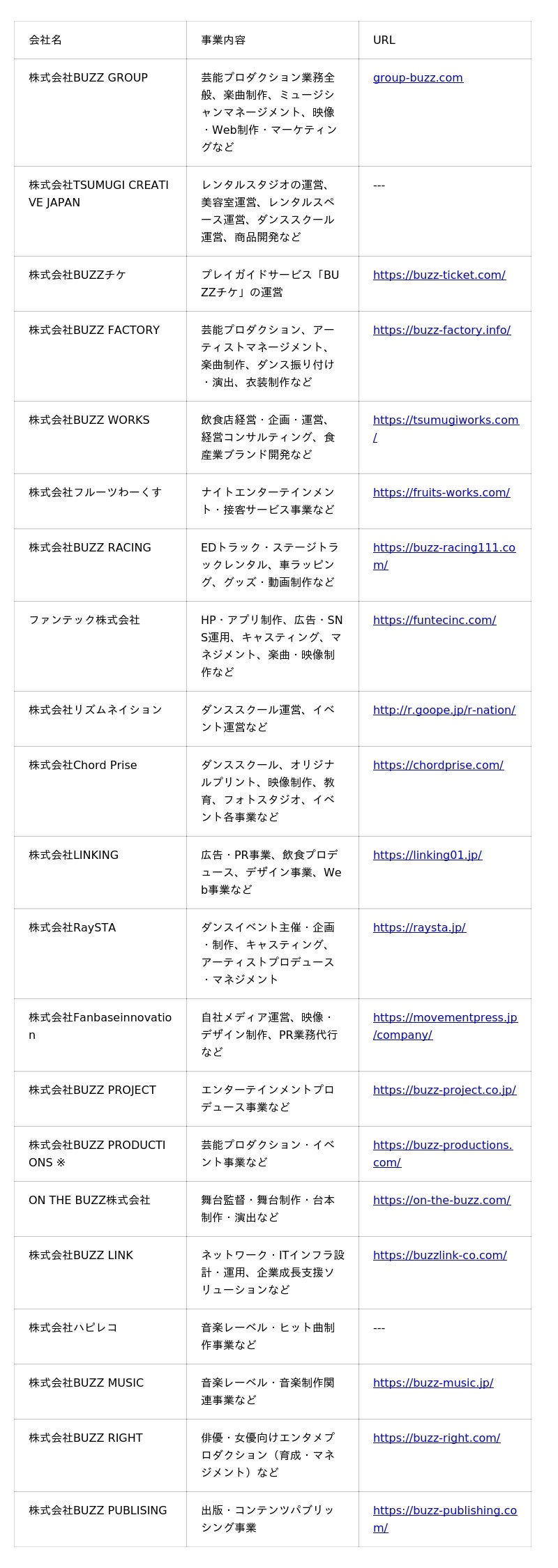 ※ 株式会社BUZZ PRODUCTIONSは当社グループ会社です。「BUZZ PRODUCTION」(末尾Sなし)は別会社であり、当社とは無関係です。