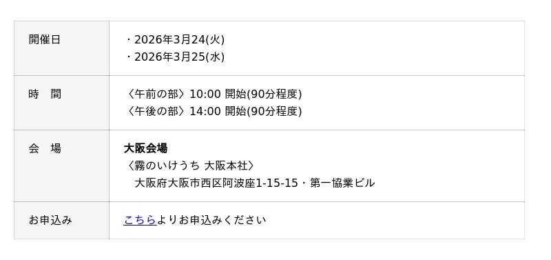 公式ページ及び、上記開催地からご都合の良い会場と日程を選んでお申し込みください。