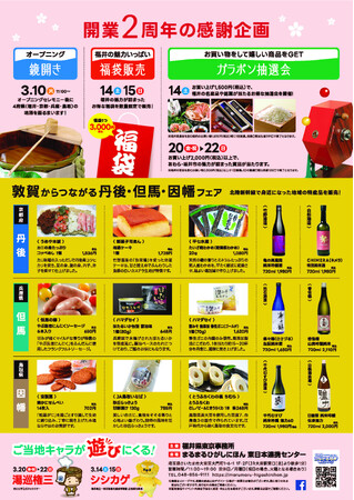 まるまるひがしにほんでは、3月10日(火)から22日(日)まで「北陸新幹線福井・敦賀間開業2周年感謝祭」と題し、福井県の魅力が詰まったフェアを開催します!水ようかん、焼き鯖寿司などの福井の名産品や地酒の販売をはじめ、鏡開きにガラポン抽選会といった企画も盛りだくさん! まるまるひがしにほんへぜひお越しください!