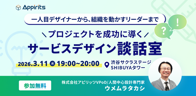 株式会社アピリッツは、2026年3月11日(水)、「【一人目デザイナーから、組織を動かすリーダーまで】プロジェクトを成功に導くサービスデザイン談話室」を開催いたします。