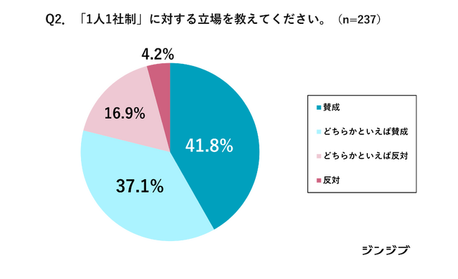 「賛成」(41.8%)「どちらかといえば賛成」(37.1%)を合わせて78.9%と、約8割の教員が1人1社制に対して賛成の立場であることがわかりました。