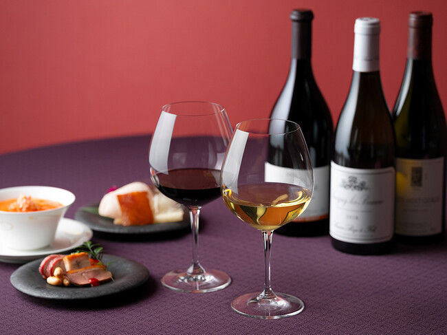 本イベントでは、オークラが誇る伝統のメニューの中から、じっくりと焼き上げたチャーシューを含む「焼き物三種盛り合わせ」、8時間かけて煮込んだ上湯とかにの濃厚な旨味が楽しめる「かに卵入りふかひれスープ」をはじめ、点心や肉料理など全8品の特別コースをご用意します。ワインは、新料理長 岩崎の料理に合わせて、優しく、深い味わいのブルゴーニュ・ワインを中心に厳選。焼き物には若いヴィンテージの赤ワインを、点心や魚料理には温度を整えた白ワインを合わせてご提供します。料理ごとに広がるマリアージュを心ゆくまでご堪能ください。