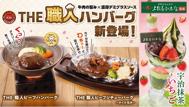 ガストが“洋食の巨匠” “老舗茶舗”と初コラボ!「THE 職人ハンバーグ」と「宇治抹茶×いちごスイーツ」が新登場!