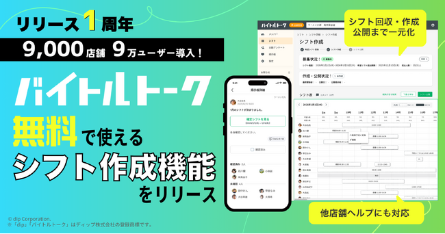 ディップ株式会社(以下「当社」)と株式会社アイリッジ(東京証券取引所グロース:3917、以下「アイリッジ」が共同で開発した店舗管理者とアルバイト従業員のコミュニケーションを改善するサービス「バイトルトーク」(以下「本サービス」)が2025年2月のサービス開始から1周年を迎え、3,000社9,000店舗導入を果たしました。さらに、本サービスは2026年2月24日より新機能「シフト作成機能」を提供開始いたしました。