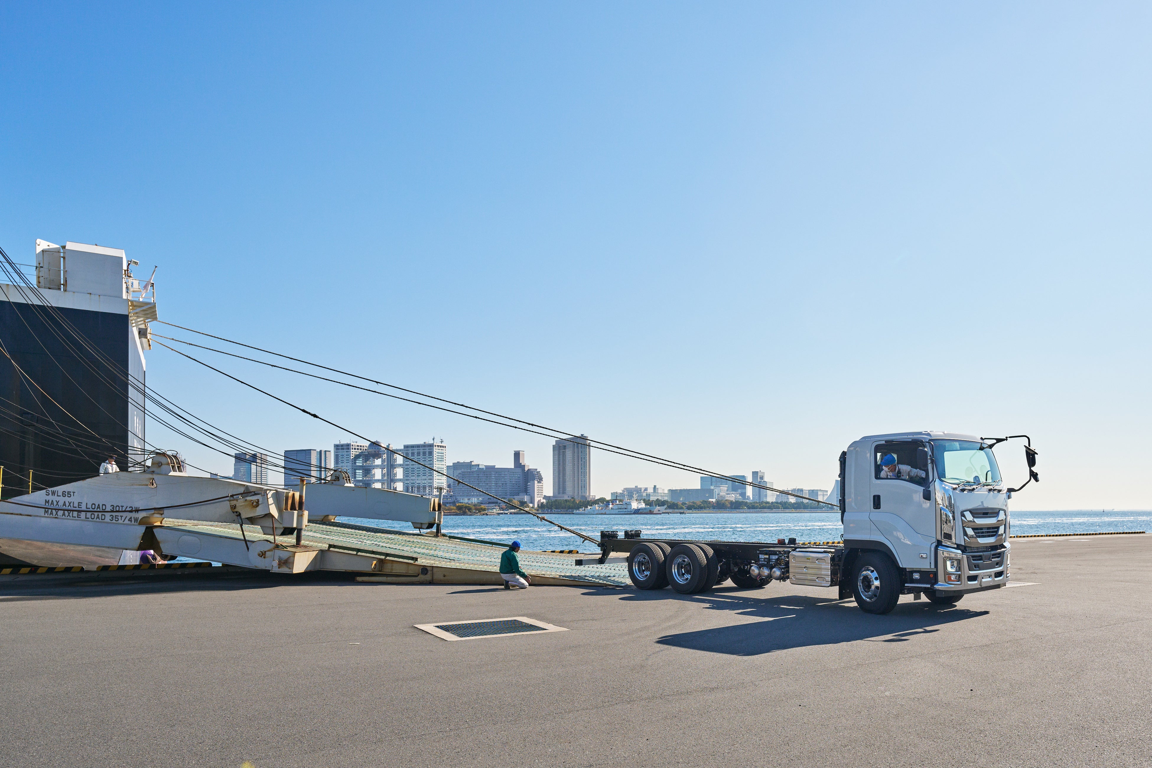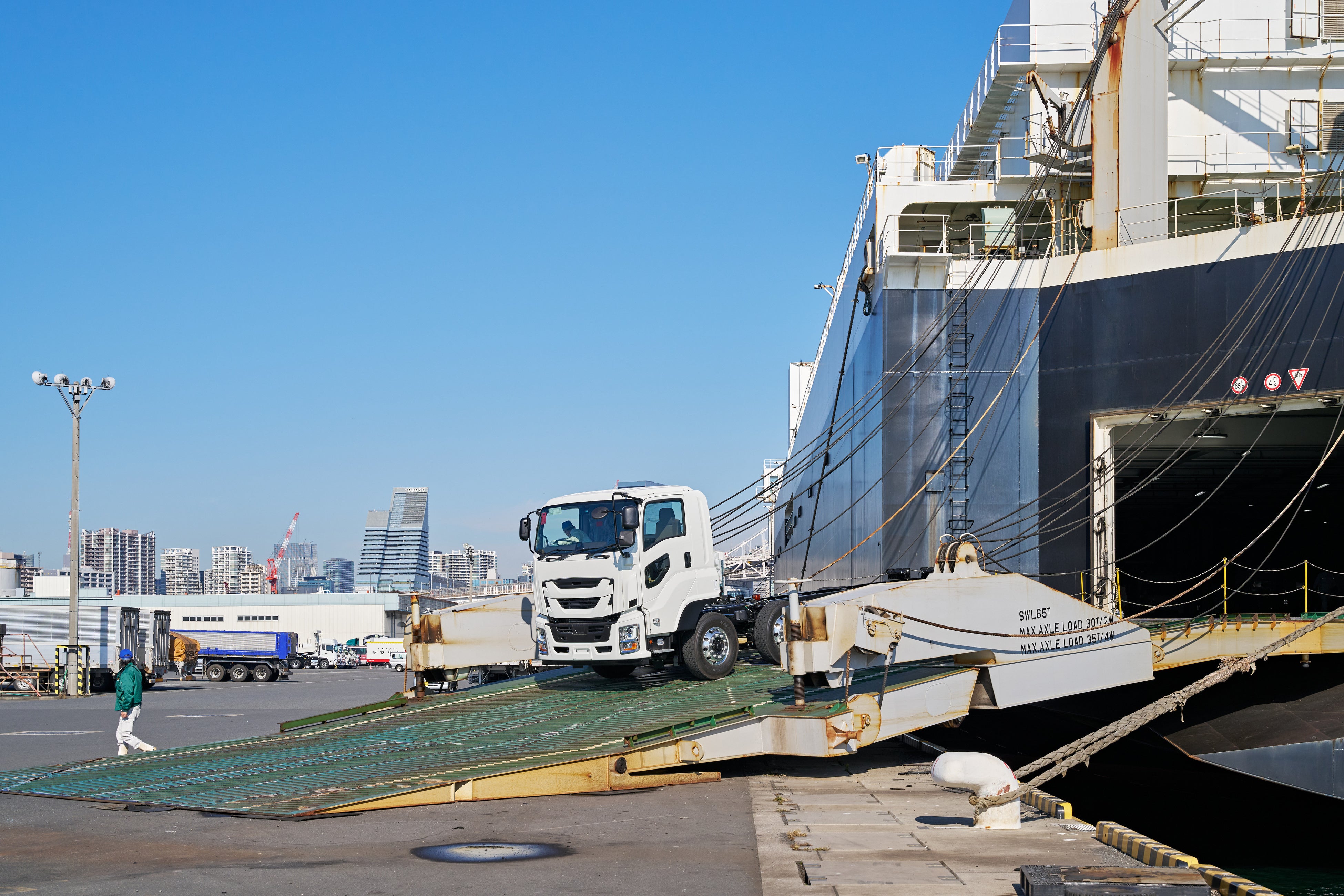 いすゞロジ様は、いすゞ自動車 藤沢工場で生産される大型・中型・小型の各車輛を品川港等まで搬送したのち、栗林商船グループのRORO船等を利用し国内の車両物流を実現しています。