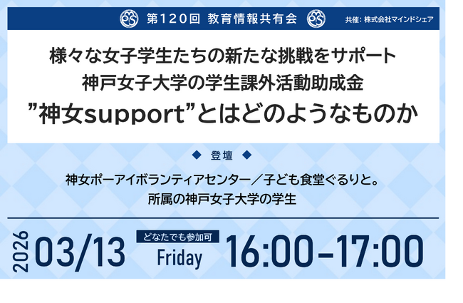 第120回教育情報共有会「様々な女子学生たちの新たな挑戦をサポート 神戸女子大学の学生課外活動助成金”神女support”とはどのようなものか」・日時:2026年3月13日(木)16時00分~17時00分