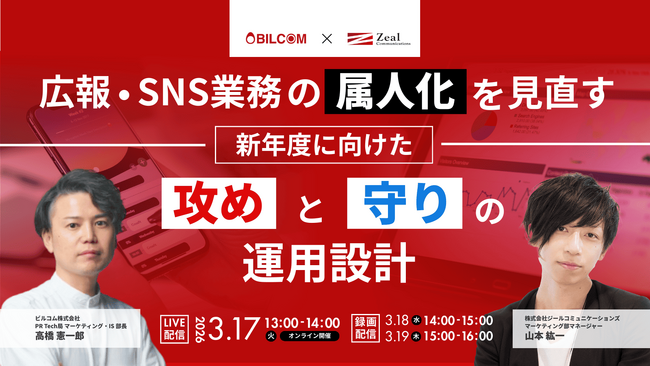 株式会社ジールコミュニケーションズ(本社:東京都渋谷区、代表:薮崎 真哉)は、2026年3月17日~19日の3日間、ビルコム株式会社(東京都港区、代表:太田 滋)と共同開催にて【広報・SNS業務の属人化を見直す 新年度に向けた「攻め」と「守り」の運用設計】と題したオンラインセミナーを開催いたします。