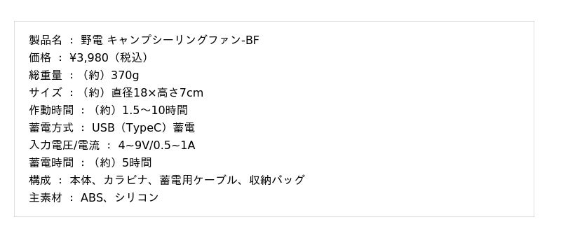 テント内を涼しく快適に保つ軽量で吊り下げ可能な蓄電式扇風機「野電 キャンプシーリングファン-BF 」をキャンプはもちろん、ちょっとした外作業やピクニックなど、様々なアウトドアシーンでぜひご活用ください。