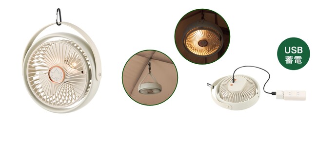 本体には、シリコン製ハンドルとカラビナを備えており、テント内やキャノピーに吊り下げ可能。また、底面には三脚用ネジ穴を搭載しているため、市販のカメラ三脚などを取り付ければ卓上扇風機としても使えるため、キャンプサイト内のさまざまなシーンで活躍する。