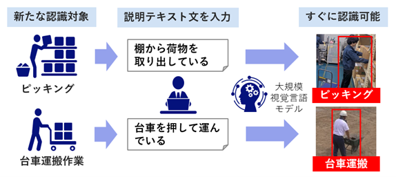 新たに開発したNEC独自の映像分析技術と自然言語処理技術 (注1) により、ユーザーが映像中の特定の作業行動や状況を、テキスト入力だけで簡単に指定できるようになりました。例えば「荷物を棚から取る作業」「機械の前に立っている状態」など、平易な文章を入力するだけで、AIが条件に合致する場面を自動認識します。これにより、従来は数週間かかっていたサービス導入前の作業が最短数時間で完了し、即日導入も可能になります。