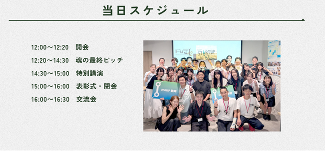 当日は、鈴木康友静岡県知事・起業家・経営者・行政関係者等による審査を実施。さらに、特別講演として実業家・投資家の成田修造氏をお迎えし、次世代に向けたメッセージをお届けいただきます。高校生の本気の挑戦と、第一線で活躍する実践者の言葉が交差する1日となります。