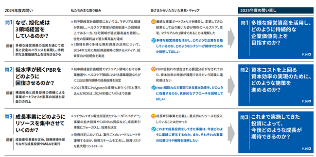 当社の統合報告書は、投資家をはじめとするステークホルダーの皆さまの疑問に真正面から向き合い、対話するためのツールと位置付けています。今年度は、昨年度にステークホルダーの皆さまからの「6つの問い」への回答に対していただいたご意見や当社の取り組みの進捗を踏まえて改めて問いを立て直し、さらに踏み込んで回答する構成としました。