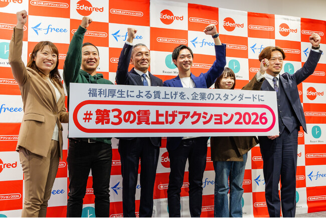 福利厚生の食事補助サービス「チケットレストラン」を提供する株式会社エデンレッドジャパン、従業員の様々な生活出費を補助する「freee福利厚生 ベネフィットサービス」を提供するフリー株式会社、旅行特化型福利厚生「リゾートワークス」を展開する株式会社リゾートワークスの3社は、新プロジェクト「#第3の賃上げアクション2026」について説明する発表会を2026年2月12日(木)に実施しました。