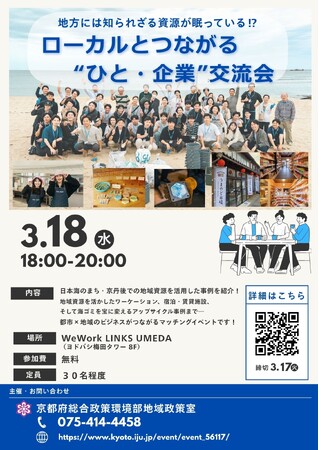 ■京都府では、府内の遊休資産・地域資源を活用した地域ビジネスを生み出し、関係人口の拡大につなげることを目的として、地域のキーパーソンと都市部の企業・人材によるビジネスマッチングのイベントを、3月18日に大阪で開催します。(参加無料、要予約)