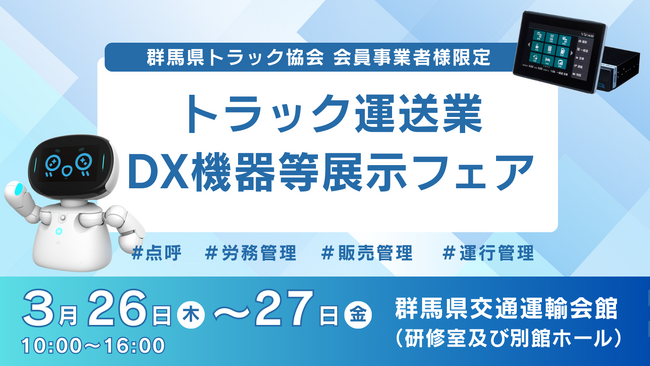 株式会社ナブアシスト(本社:群馬県前橋市、代表取締役:江口 大介、以下 ナブアシスト)は、3月26日(木)・27日(金)に群馬県交通運輸会館にて開催される「トラック運送業DX機器等展示フェア」に出展することをお知らせいたします。