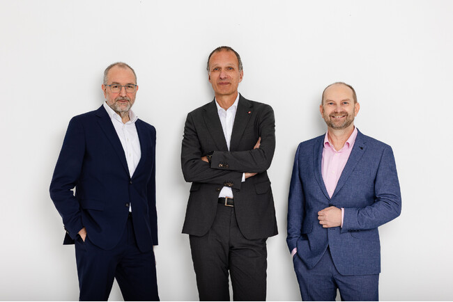 (左から)コンラート・ガーハマー(Konrad Garhammer, COO兼CTO)、ドミニク・レッシング(Dominik Ressing, CEO)、ピーター・ミュラー(Peter Müller, グローバル カスタマー アプリケーション センター VP)がコンガテックの新しいカスタマイズおよびソフトウェア インテグレーション サービス aReady.YOURS を紹介