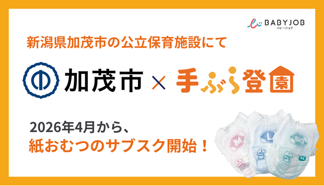 BABY JOB株式会社(本社:大阪府大阪市、代表取締役 上野公嗣)は、2026年4月より新潟県加茂市のすべての公立保育施設(2園)において、保育施設向けの紙おむつとおしりふきのサブスク「手ぶら登園」が開始されます。今回導入するおむつは、現場の保育士の声を反映した専用おむつであり、サイズが一目で分かる表示などにより、保育士にとってより使いやすい仕様となっています。