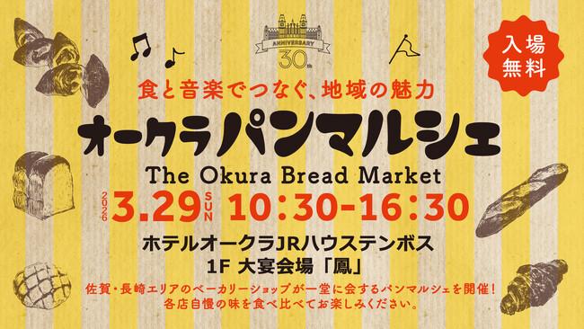 ホテルオークラJRハウステンボス(長崎県佐世保市ハウステンボス町10番、総支配人 蛭川 和洋)は、2026年3月29日(日)に、地域の皆様への感謝を込めた特別イベント『食と音楽でつなぐ、地域の魅力 オークラパンマルシェ』を開催いたします。