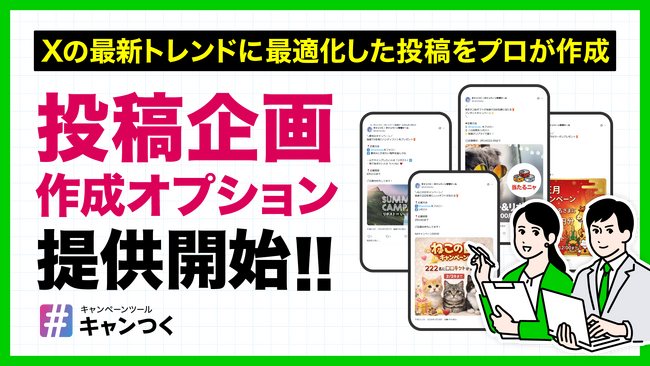 ひとりでも勝てるキャンペーンツール「キャンつく」を提供する株式会社ピクルス(東京都品川区、代表取締役 田中 稔、以下「当社」)は、SNSキャンペーンツール「キャンつく」の新オプションとして、キャンペーン用投稿の企画・作成代行サービス「投稿企画・作成オプション」の提供を開始いたします。投稿文の作成から投稿画像の制作、投稿代行までをワンパッケージで提供し、料金は1投稿5万円からご利用いただけます。