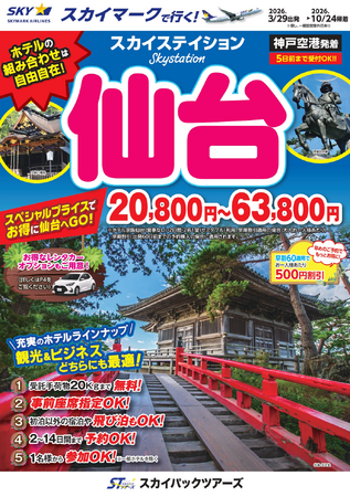 スカイパックツアーズ株式会社(本社:東京都中央区、社長:横山正巳)は、スカイマークを利用した価格固定型のパンフレット旅行商品「スカイステイション 仙台」【神戸空港発着】(2026年3月29日出発~2026年10月24日帰着)の販売を開始します。スカイマークだけを取り扱う専売店だからできるスペシャルプライス!早めのご予約がお得です。