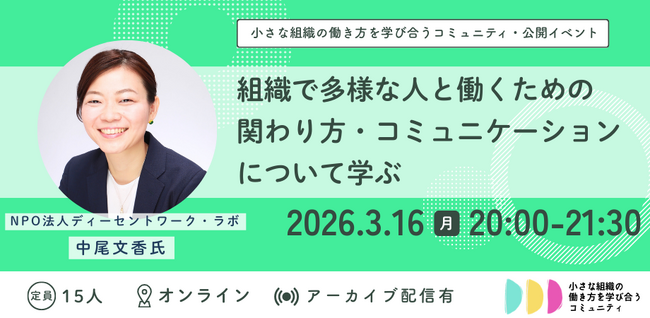 【小さな組織の働き方を学び合うコミュニティ・公開イベントの開催】組織で多様な人と働くための関わり方・コミュニケーションについて学ぶ
