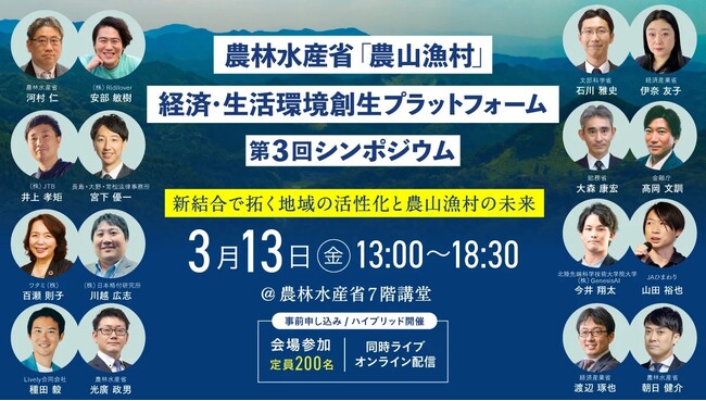 関連記事:【プログラム詳細・登壇者決定】農林水産省「農山漁村」経済・生活環境創生プラットフォーム第3回シンポジウム~3月13日(金)13時から農林水産省講堂&オンラインでハイブリッド無料開催~ | 株式会社Ridiloverのプレスリリース