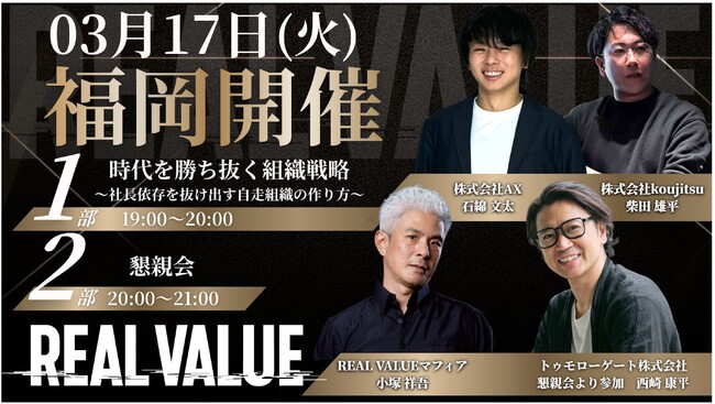 【3/17(火)福岡開催】株式会社AX、代表・石綿文太が「REALVALUE×知足 福岡イベント」に登壇。"社長依存からの脱却"と自走組織のつくり方について対談