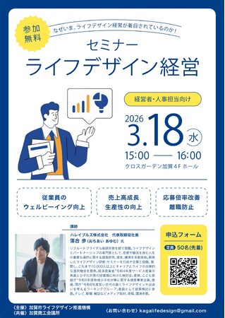 このたび、加賀市において「ライフデザインセミナー」を開催いたします。本セミナーでは、個人の人生設計(ライフデザイン)と企業経営・人材戦略との関係性に着目し、これからの時代に求められるライフデザイン経営のあり方について考えます。