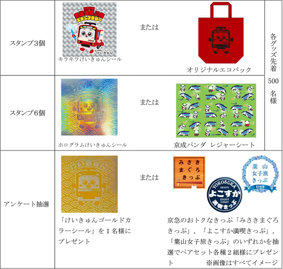 また,6個集めて,アンケートにご回答いただいた方の中から抽選で,京急のおトクなきっぷ「みさきまぐろきっぷ」,「よこすか満喫きっぷ」,「葉山女子旅きっぷ」をそれぞれペアセット各種2組様にプレゼント,または「けいきゅんゴールドカラーシール」を1名様にプレゼントいたします。