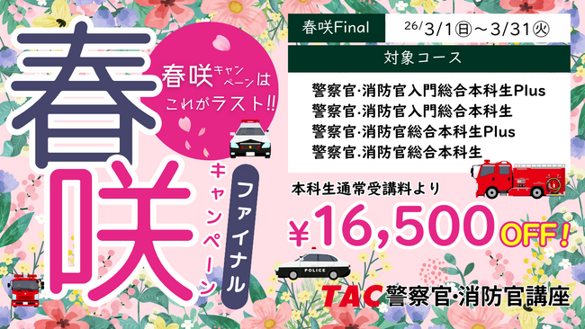 【TAC警察官・消防官(消防士)】「春咲キャンペーンFinalで2027年合格目標コースが1.65万円引き!」(~3/31)