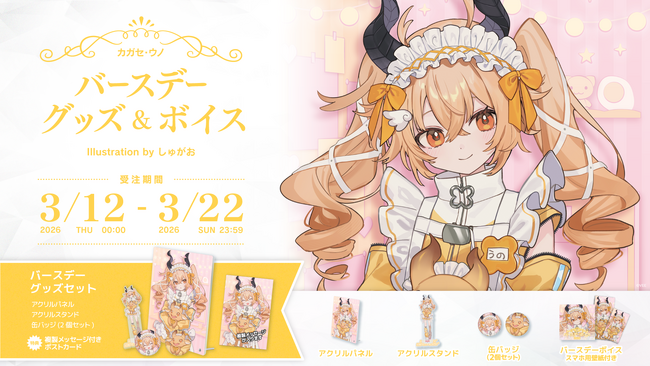 本日・3月12日に誕生日を迎えたカガセ・ウノのバースデーグッズの詳細を公開するとともに、公式オンラインショップ「VEE Official Shop」にて受注販売を開始しました。