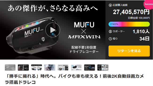 カー用品・バイク用品ブランドMAXWIN(運営:昌騰有限会社、所在地:大阪府泉大津市)は、Makuakeにて物理ボタンが無く取り付けるだけで録画を開始する画期的なドライブレコーダーMUFUシリーズの最新作『MF-V40』を2026年2月24日より先行販売を開始し、約1週間で初回入荷数を完売し総額2,700万円を超え目標を達成したことをお知らせします。