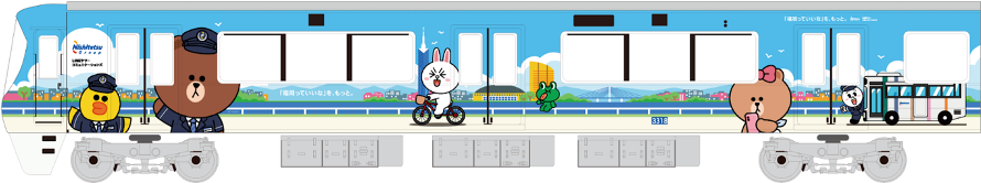 西日本鉄道とのDX推進協定締結から5周年を記念したラッピング電車が運行を開始します。西鉄の制服を着たLINE FRIENDSキャラクターなど福岡のために書き下ろしたオリジナルデザインをあしらったデザインです。