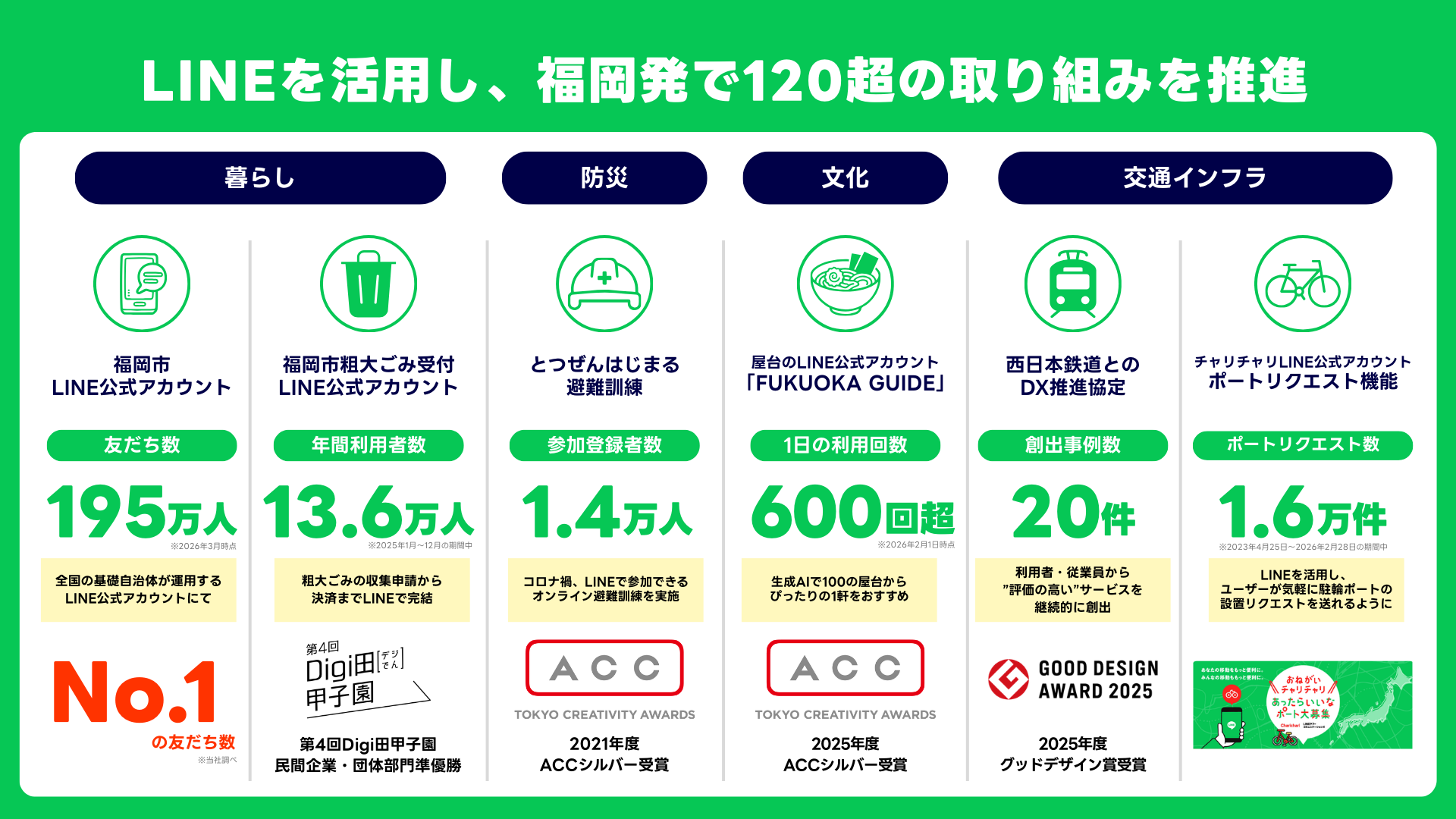 本事業は、2016年の福岡市との連携協定締結を起点にスタートし、2021年には西日本鉄道とのDX推進協定を締結するなど、連携・共創の輪を拡大してきました。これまでに、LINEの技術を活用した行政情報の発信や各種手続きのデジタル化といった、市民生活に密着した取り組みを120件以上推進しています。