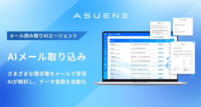 アスエネ株式会社(本社:東京都港区、Founder 代表取締役CEO:西和田浩平)は、CO2排出量の見える化・削減・報告クラウド「ASUENE」において、メールで受領した請求書などをAIが読み取り、CO2排出量算定に必要なデータを自動で登録する機能を追加しました。
