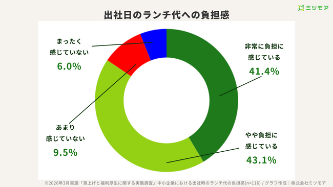 中小企業の若手社員に、昨今の物価高のもとで出社時のランチ代がどの程度負担になっているかを聞いたところ、「非常に負担に感じている」「やや負担に感じている」を合わせて84%が「負担」と回答しました。