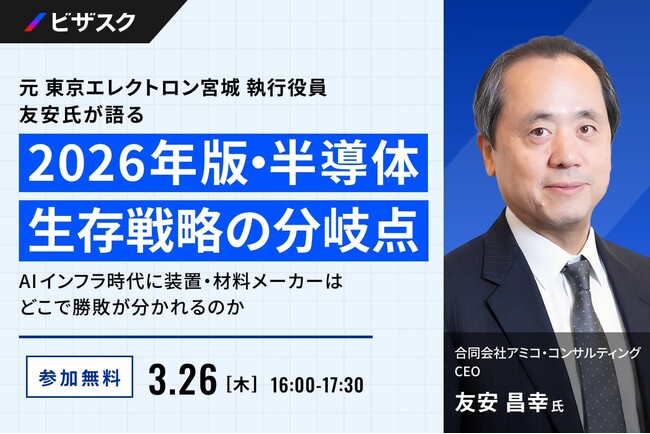 「知見と、挑戦をつなぐ」をミッションにグローバルなナレッジプラットフォームを運営する株式会社ビザスク(以下、当社)は、『2026年版・半導体生存戦略の分岐点』をテーマに、合同会社アミコ・コンサルティング CEO 友安 昌幸 氏 ご登壇による無料オンラインセミナーを 3/26 (木) 16:00 より開催します。
